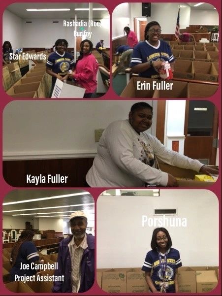 Nichols Temple Thanksgiving Basket Committee and the Ambassadors of Lawson State Community College preparing the baskets for distribution.